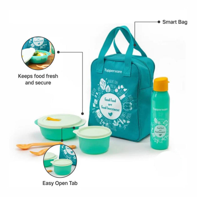 Embrace freshness, convenience, and eco-conscious style with the Tupperware Go Green Lunch Set. Designed with a nature-inspired printed design and fresh color palette, this all-in-one meal set promotes healthy living and mindful eating on the go.
